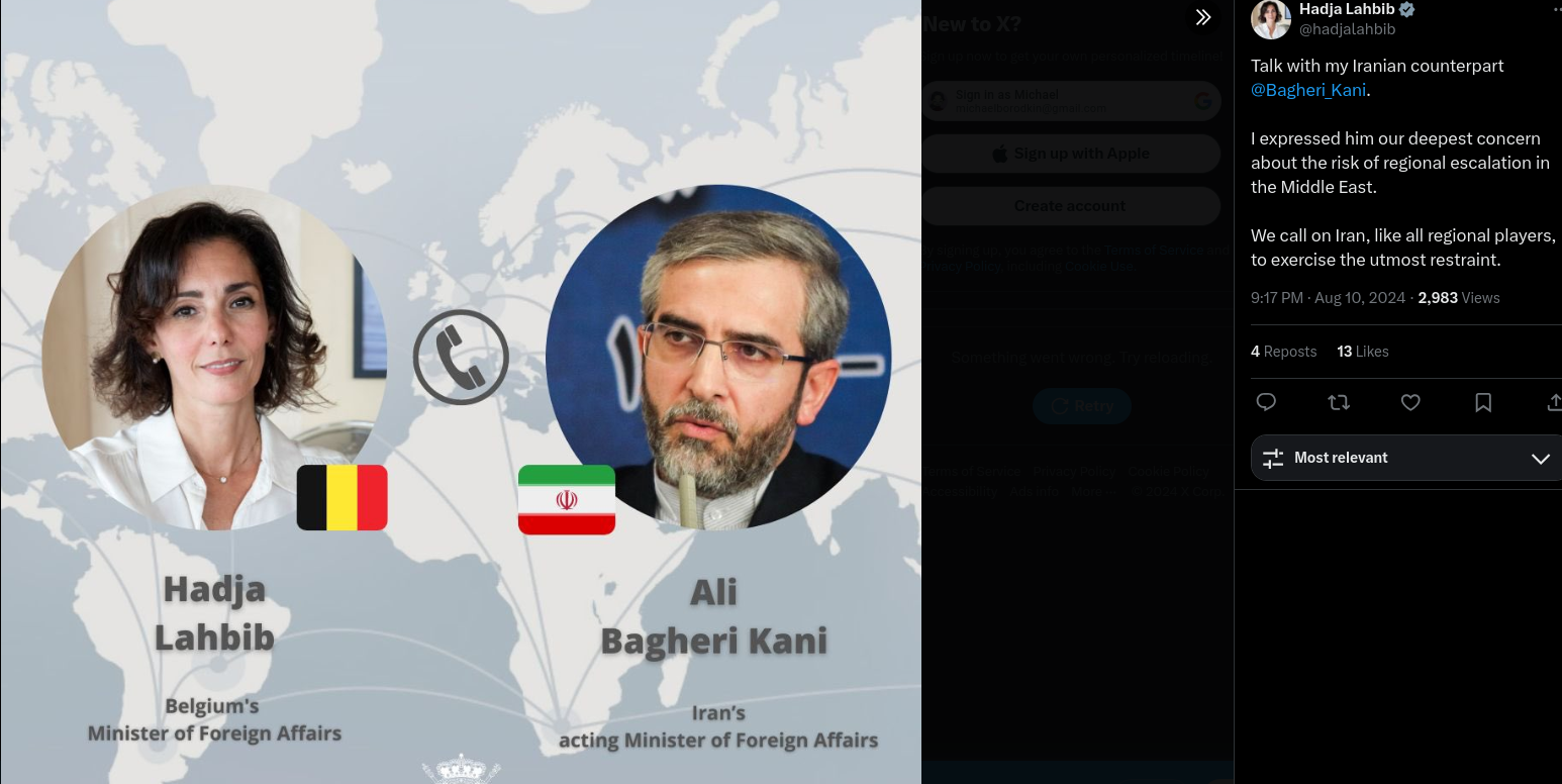 Министр иностранных дел Бельгии Хаджа Лахбиб побеседовала со своим иранским коллегой Али Багери Кани и обсудила ситуацию в ближневосточном регионе. В своем микроблоге на сервисе Х она написала, что призвала Иран к сдержанности. Речь идет о подготовке иранского ответа на уничтожение в Тегеране главаря террористической организации ХАМАС Исмаила Хании.